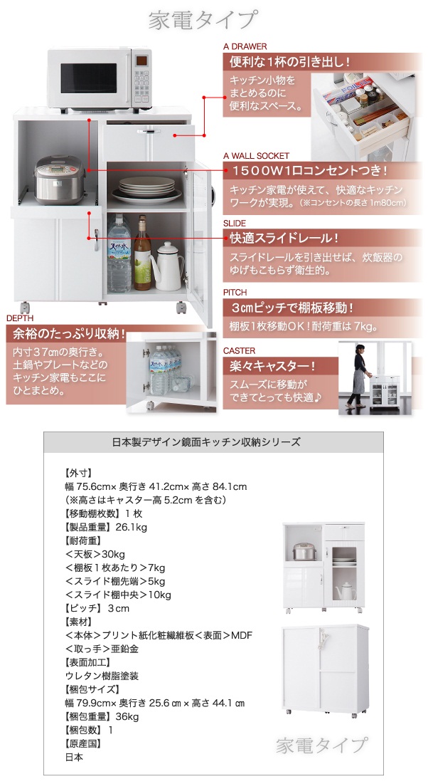 ・・食器棚ってどれも同じようなデザインばかりでつまらない。お洒落なのがあっても高かったり・・・。そんな声にお応えしてお手頃価格のデザイン食器棚を作りました。もちろん品質や機能にも妥協は無し。実用性にも優れる鏡面仕上げでタイプも4タイプ用意してありますので、ピッタリな収納力をお選びください。
